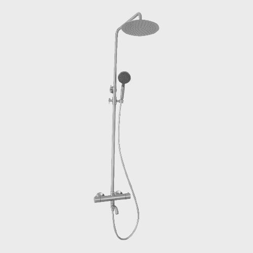 Takduschset i rostfritt stål. Termostatblandare med integrerad omkastare och infällbar badkarspip. Slang anti-twist. Tre funktioner: