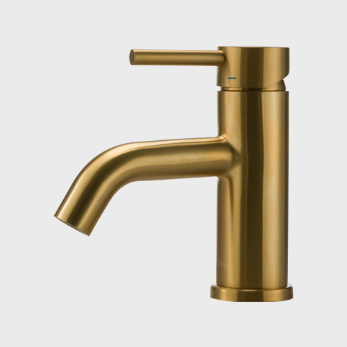Tvättställsblandare i rostfritt stål. Stilren modell med rund kropp och böjd pip.